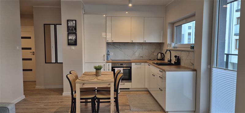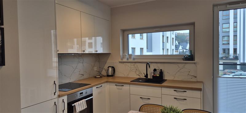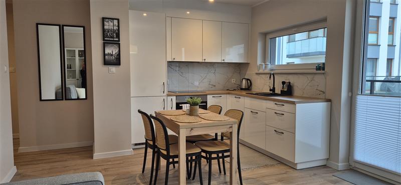 - Przestronny salon z aneksem kuchennym, w pełni wyposażona kuchnia (lodówka, płyta indukcyjna, piekarnik, zmywarka, okap), część wypoczynkowa z wygodną sofą i stołem.