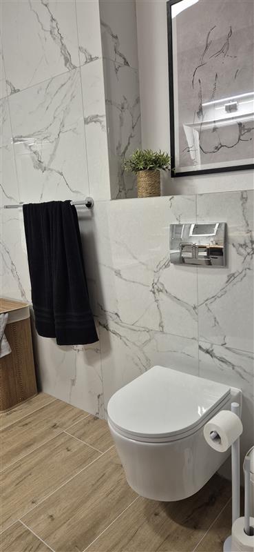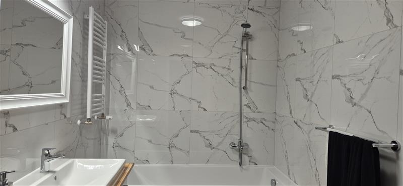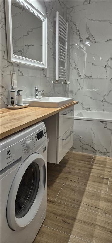 - Łazienka z wanną z funkcją prysznica oraz pralką.